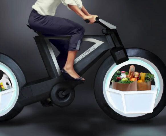 Le Cyclotron sera entièrement conçu en carbone. Comme dans le film de Disney, la bicyclette est constituée de roues sans rayons ni moyeux ni jantes, ces derniers étant remplacés par des paniers démontables afin d’y mettre toutes sortes de choses. Donc pas besoin de porte-bagages, vous pourrez directement mettre vos courses à chaque roue libre du vélo, à la place du moyeu.